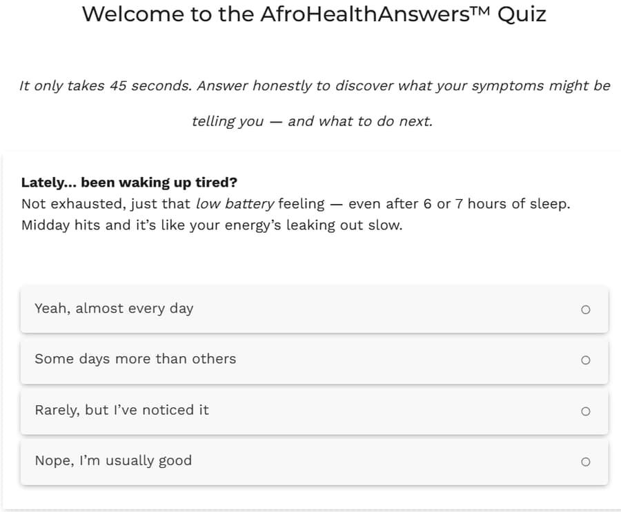 This short, culturally relevant quiz is designed specifically for Black men over 40 who:✅ Want to take control of their health before meds become mandatory